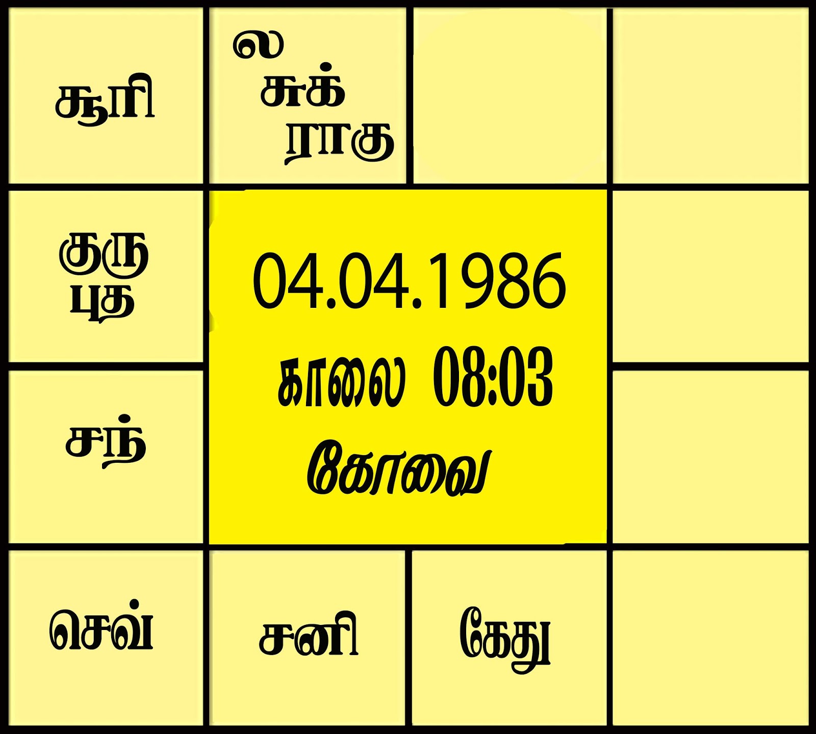 (மேஷ லக்னம், மகர ராசி, 1ல் சுக், ராகு, 7ல் கேது, 8ல் சனி, 9ல் செவ், 10ல் சந், 11-ல் புத, குரு, 12-ல் சூரி, 4-4-1986 காலை 8-3 கோவை)